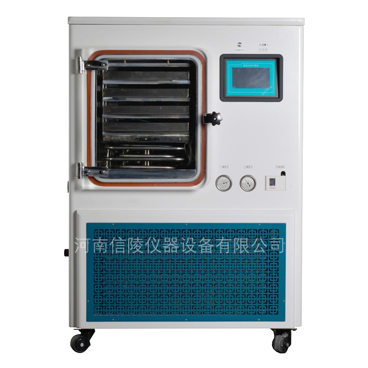 采用液晶触摸屏操作面板,可触屏操作制冷机的开关机、真空泵的开关机、编辑冻干工艺配方,显示冻干曲线、样品温度、冷阱温度、真空度、运行时间等数据;