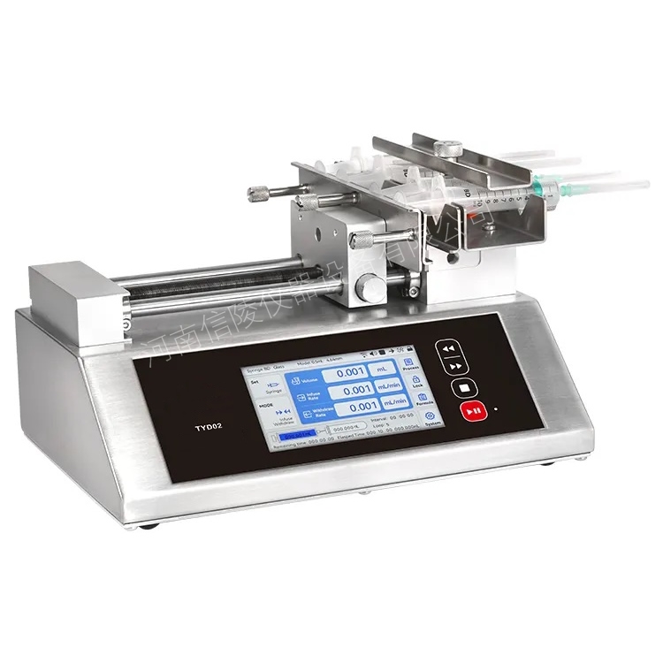 TYD02-04实验室注射泵可安装4支塑料注射器或玻璃进样针,采用5英寸彩色液晶触摸屏显示,同屏幕显示传输液量、剩余液量、流量、运行方向、注射器规格等,动画显示运行状态。流量范围:0.184nL/min(10μL) - 24.520mL/min(10mL)。可通过校正程序获得更精确的液量。可以显示注射器内当前液量和当前液量的进度;可以显示外置容器当前的液量和当前液量的进度。注射器容量范围广泛,从10μL到10mL,兼容多种厂商、规格的注射器,支持自定义注射器参数。可以设置抽取或注入的液量,点击液量值可输入数值,点击液量单位可在微升和毫升间切换;可以设置注入或抽取的流速,点击流速值可输入数值。点击流速单位可在纳升/分、微升/分、毫升/分间切换。可预存多组实验数据,搭配注射器保护、堵车报警机制,采用优异的控制系统和精密的机械结构,行程控制精度误差小于±0.35%,多种工作模式可供选择,功能强大,非常适用于科研试验中各种流体的高精度微量传输。